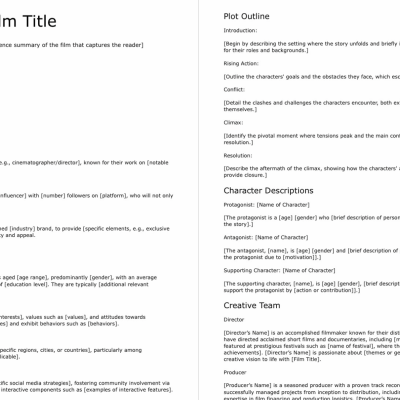 This Short Film Proposal Template not only helps you apply for film grants, attract investors, and negotiate product placement agreements but also allows you to enhance your project using AI.